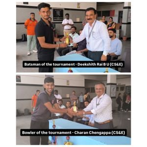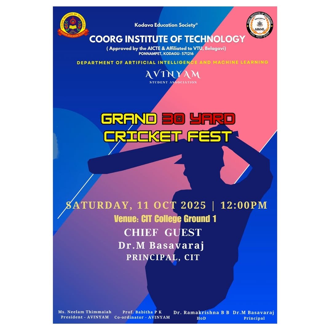 The Department of Artificial Intelligence and Machine Learning, under the AVINYAM Student Association, successfully organized the Grand 30 Yard Cricket Tournament 2025 on 11th October 2025 at CIT College Ground 1. The tournament witnessed enthusiastic participation from students, showcasing remarkable teamwork, competitive spirit, and sportsmanship. After a series of exciting matches, Team #Respect, led by Captain Dharshan A M, emerged as the winners of the tournament, while Team Alpha, captained by Charan Chengappa, secured the runners-up position. Individual excellence was also recognized, with Deekshith Rai B U (CS&E) being awarded Batsman of the Tournament and Charan Chengappa (CS&E) receiving the title of Bowler of the Tournament. The event concluded on a high note, celebrating unity, talent, and the spirit of healthy competition among students.