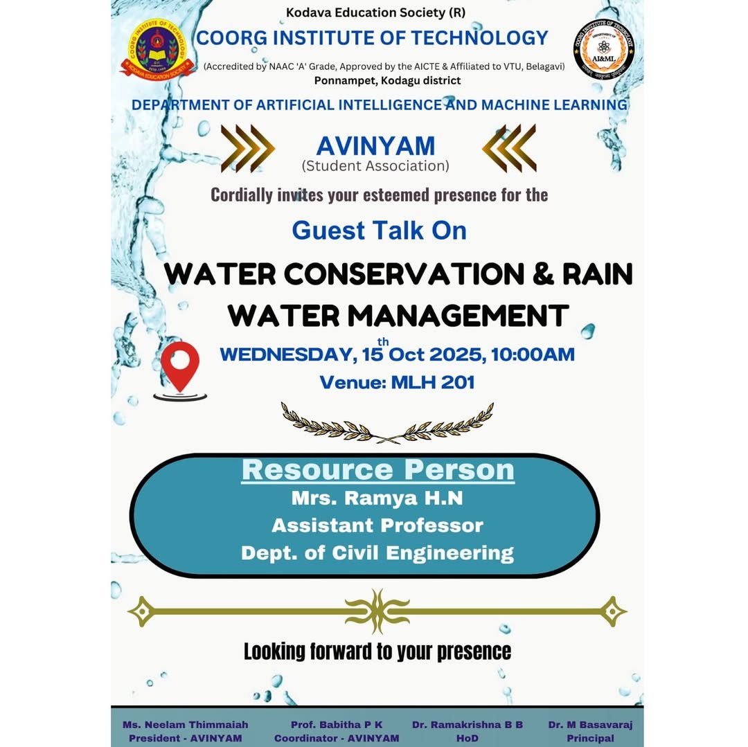 The Department of Artificial Intelligence and Machine Learning, under the AVINYAM Student Association, organized a guest talk on “Water Conservation and Rain Water Management” on 15th October 2025 at MLH 201. The session was delivered by Mrs. Ramya H. N., Assistant Professor, Department of Civil Engineering, who served as the resource person for the event. The talk provided valuable insights into sustainable water management practices, the importance of conserving water resources, and practical methods of rainwater harvesting. The session was highly informative and interactive, encouraging students to develop awareness and responsibility towards environmental sustainability. The department expresses its sincere gratitude to the resource person for sharing her expertise and to the participants for their active involvement, making the event a meaningful and enriching experience.
