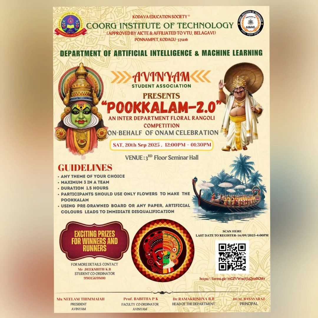 The Department proudly announces the results of the POOKKALAM-2.0 Inter-Department Floral Rangoli Competition, held on 20th September 2025, a vibrant event that celebrated creativity, teamwork, and the festive spirit. The First Place was secured by Advika, P J Pavithra, and Priyadarshini from 1st Year CS&E, followed by Second Place awarded to Anvitha, Chaithanya, and Sagari from 1st Year EC&E. The Third Place was achieved by Ganya Gowramma C B, Ranjitha, and Rashi Ponnamma M S from 1st Year AI&DS. The institution extends its heartfelt congratulations to the winners for their exceptional artistic performance and sincere appreciation to all participants for contributing to the success and vibrancy of the event.